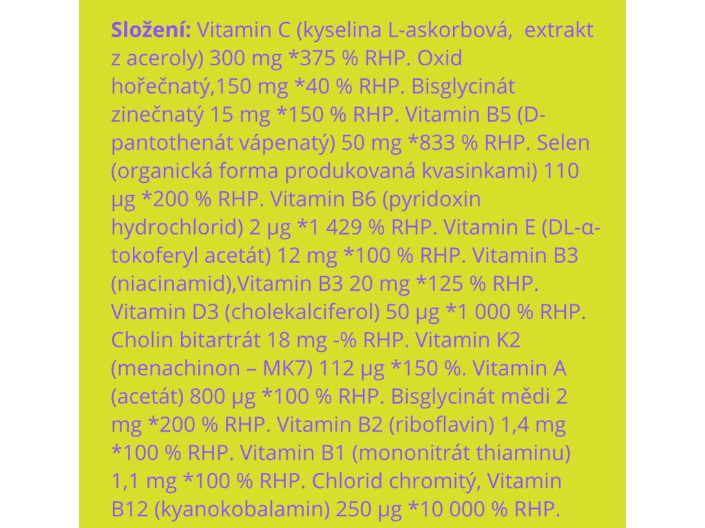 Vyvážený komplex vitaminů (A, C, D3, E, K2, B-komplex) a minerálů (zinek, hořčík, selen, měď, železo aj.)