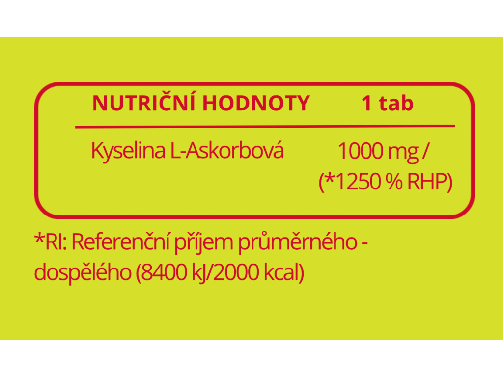Složení: Vitamin C 1000 mg (kyselina l-askorbová, protispékavá látka: stearan hořečnatý).