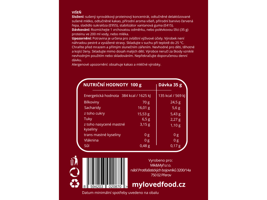 Složení: Instantní WHEY(syrovátkový) protein (80% koncentrát). Přídatné látky: aroma, steviol-glykosidy (sladidlo z rostlin stévie), sukralóza (sladidlo), sójový lecitin 0,38 % (pro instantizaci). Barvivo: červená řepa. Alergeny: bílkoviny z kravského mléka, laktóza, sója (ze sójového NON GMO lecitinu)